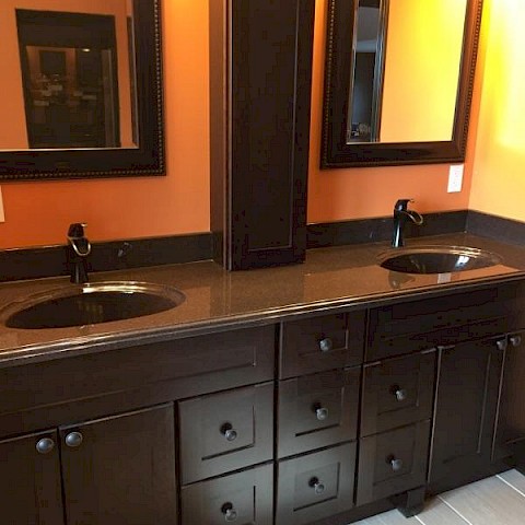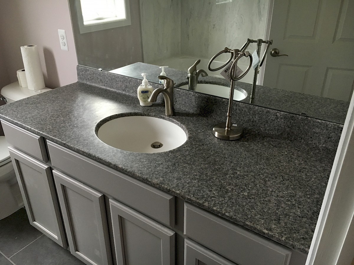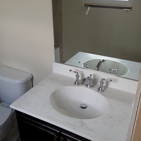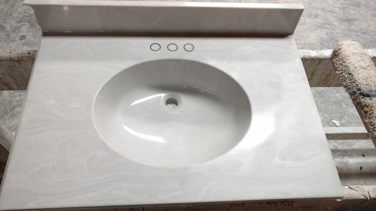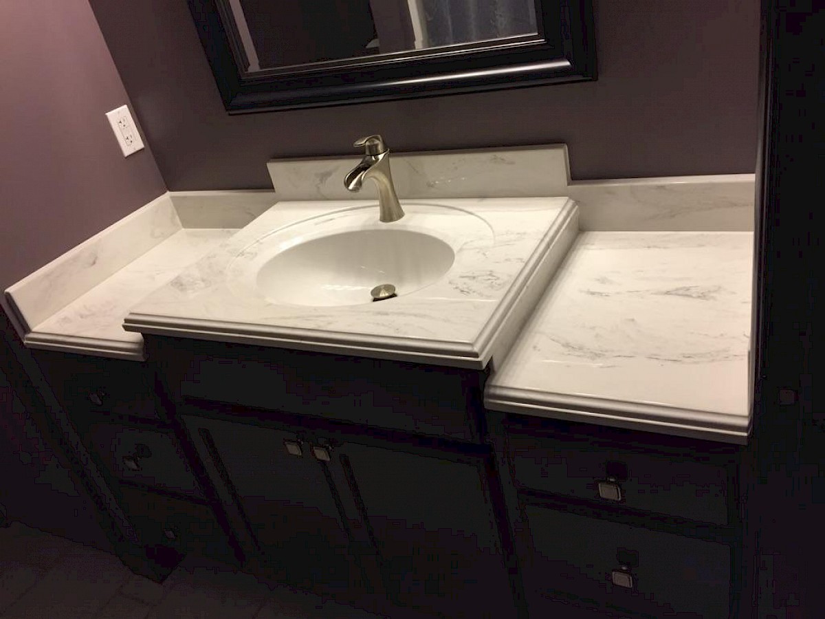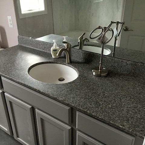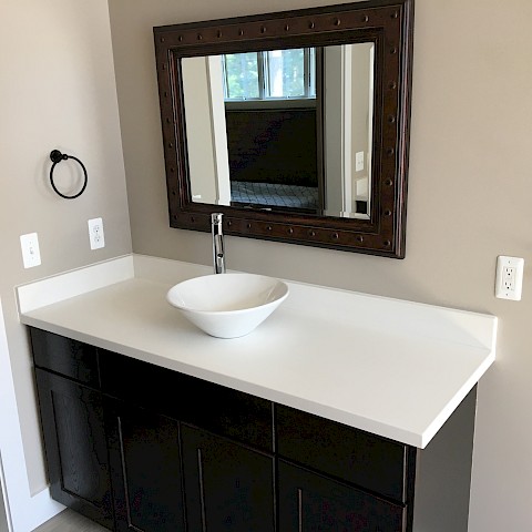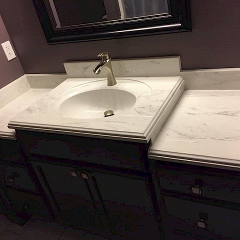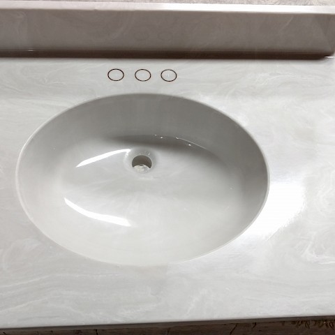 Cultured Marble and Granite vanity tops are nonporous, easy to clean and offer an integral bowl. An optional porcelain under-mount sink bowl is available in an oval or rectangular shape. These can be made with a molded on backsplash or come with a loose backsplash. Side splashes are always loose. All tops are set up custom to the measurements needed for your cabinets.