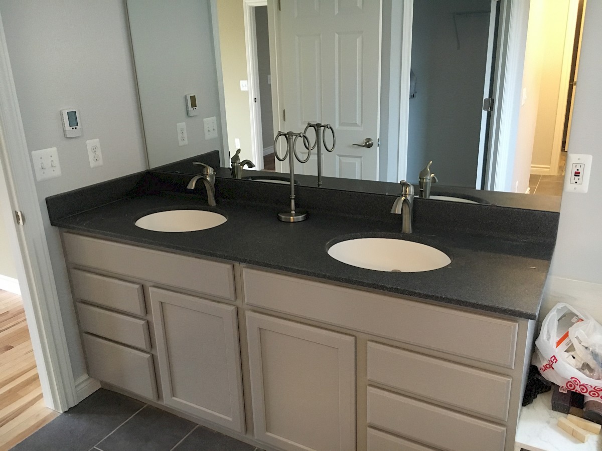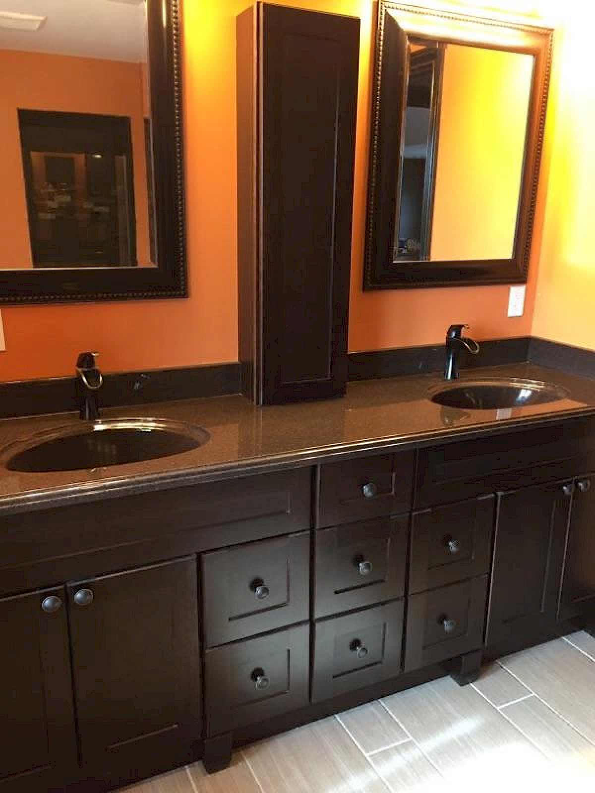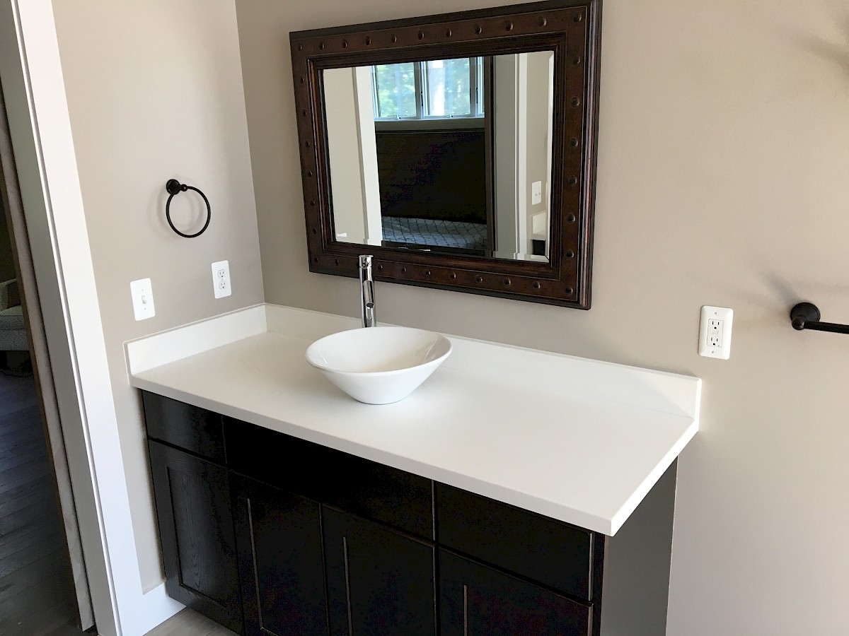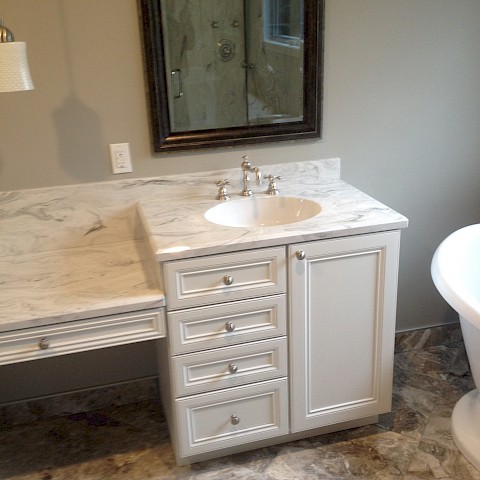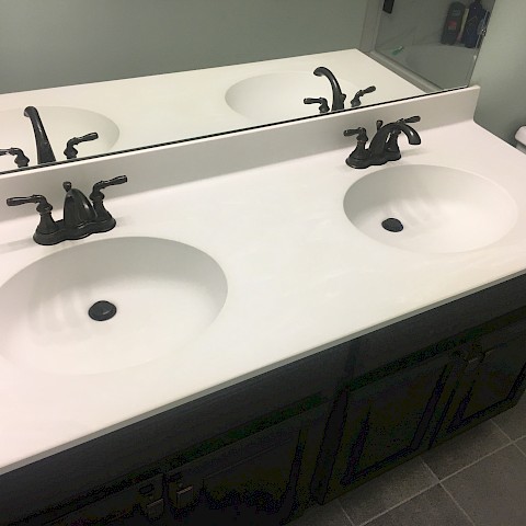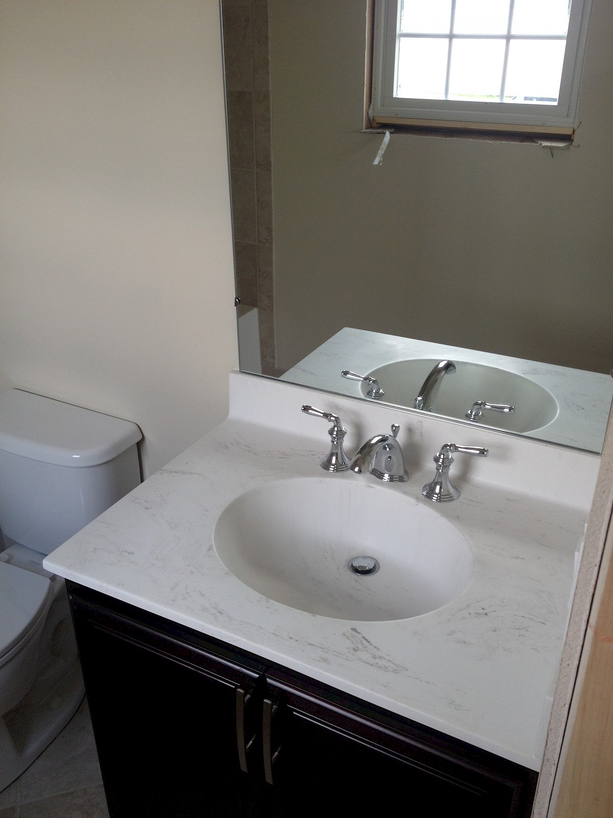Cultured Marble and Granite vanity tops are nonporous, easy to clean and offer an integral bowl. An optional porcelain under-mount sink bowl is available in an oval or rectangular shape. These can be made with a molded on backsplash or come with a loose backsplash. Side splashes are always loose. All tops are set up custom to the measurements needed for your cabinets.