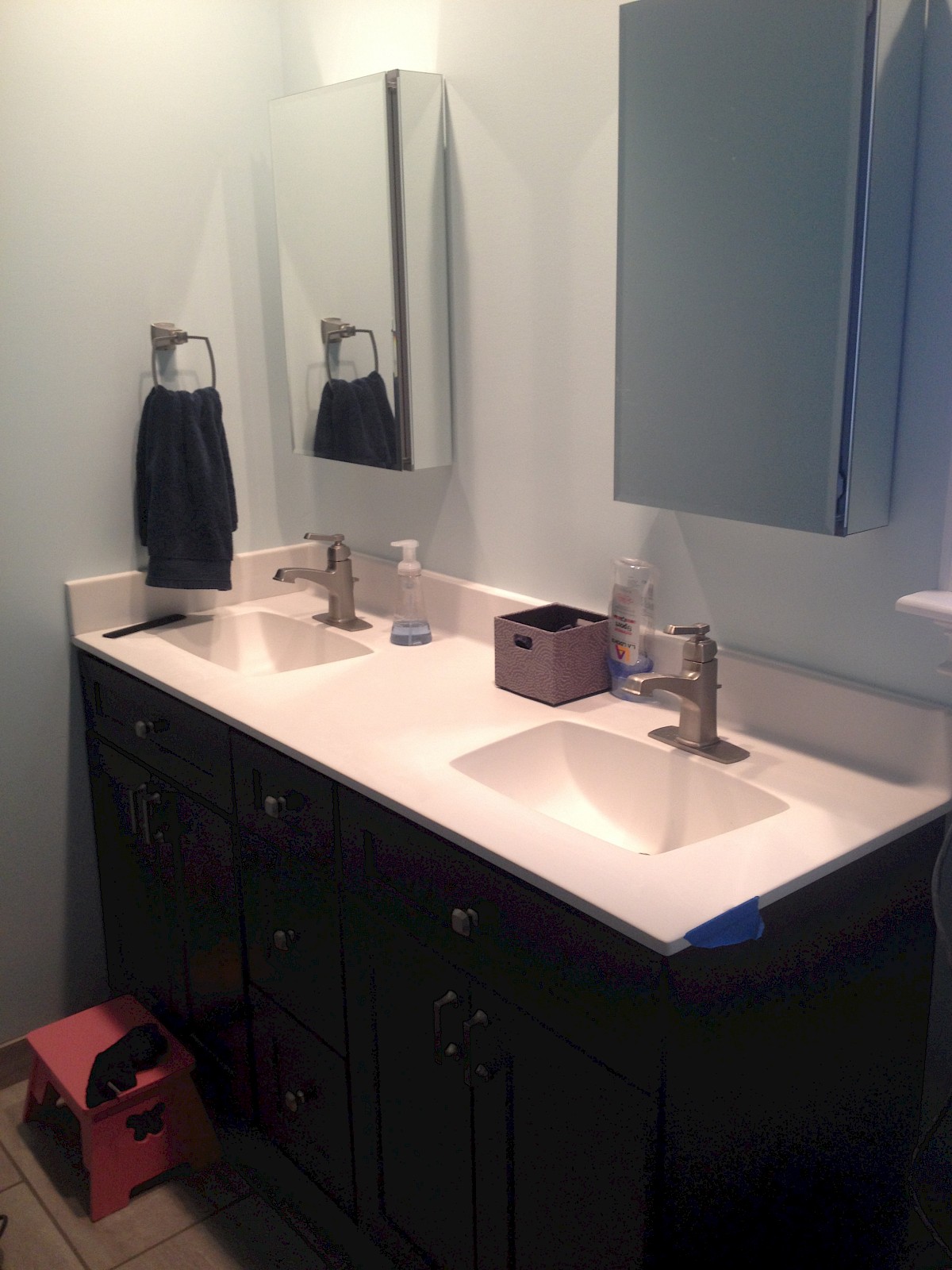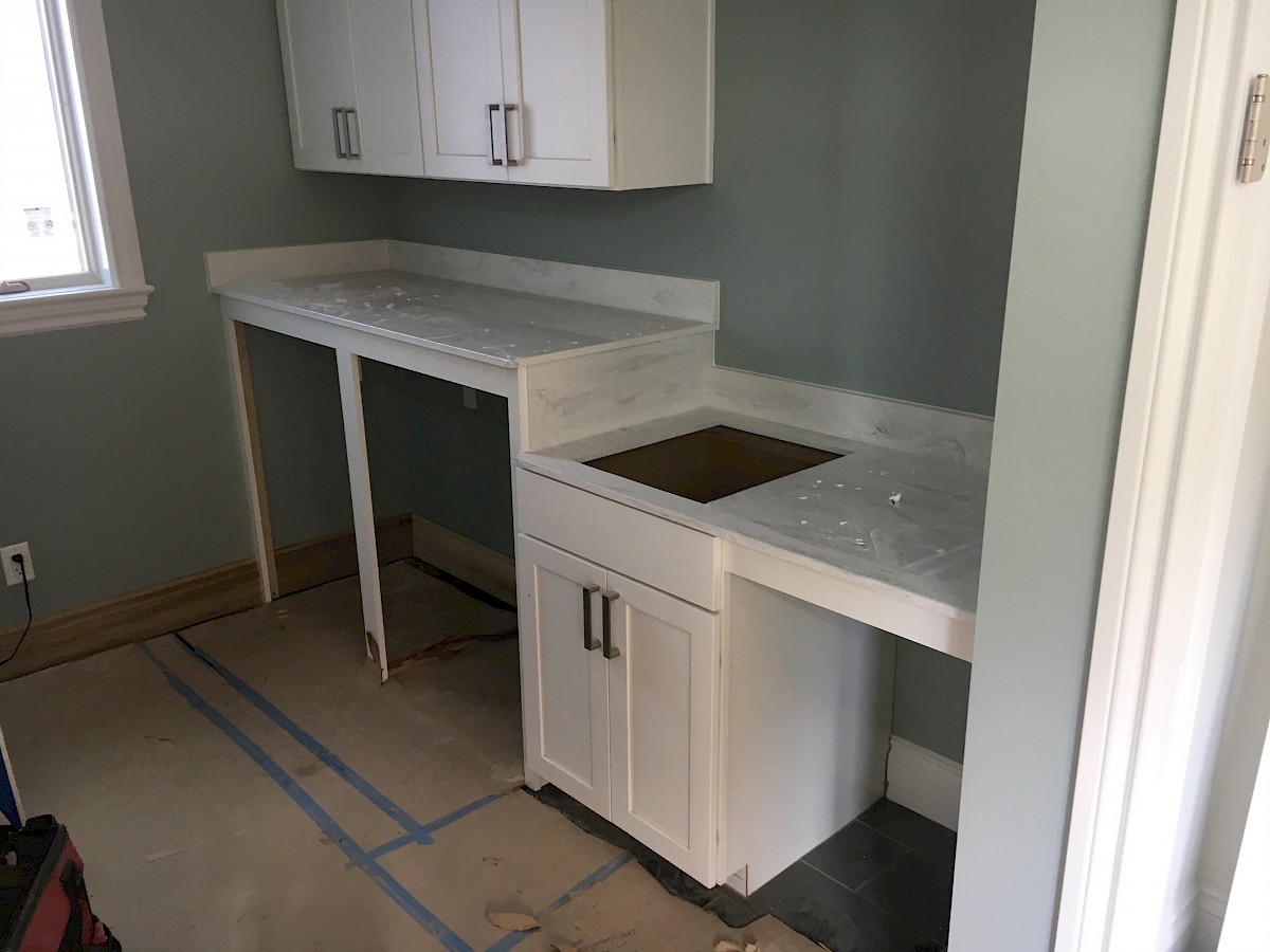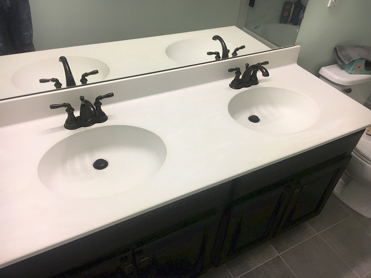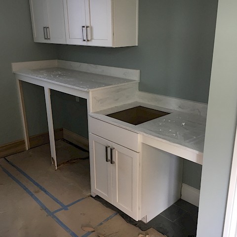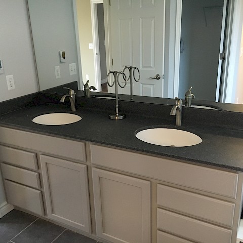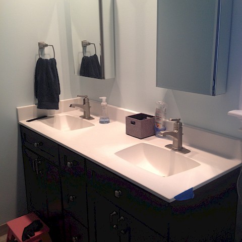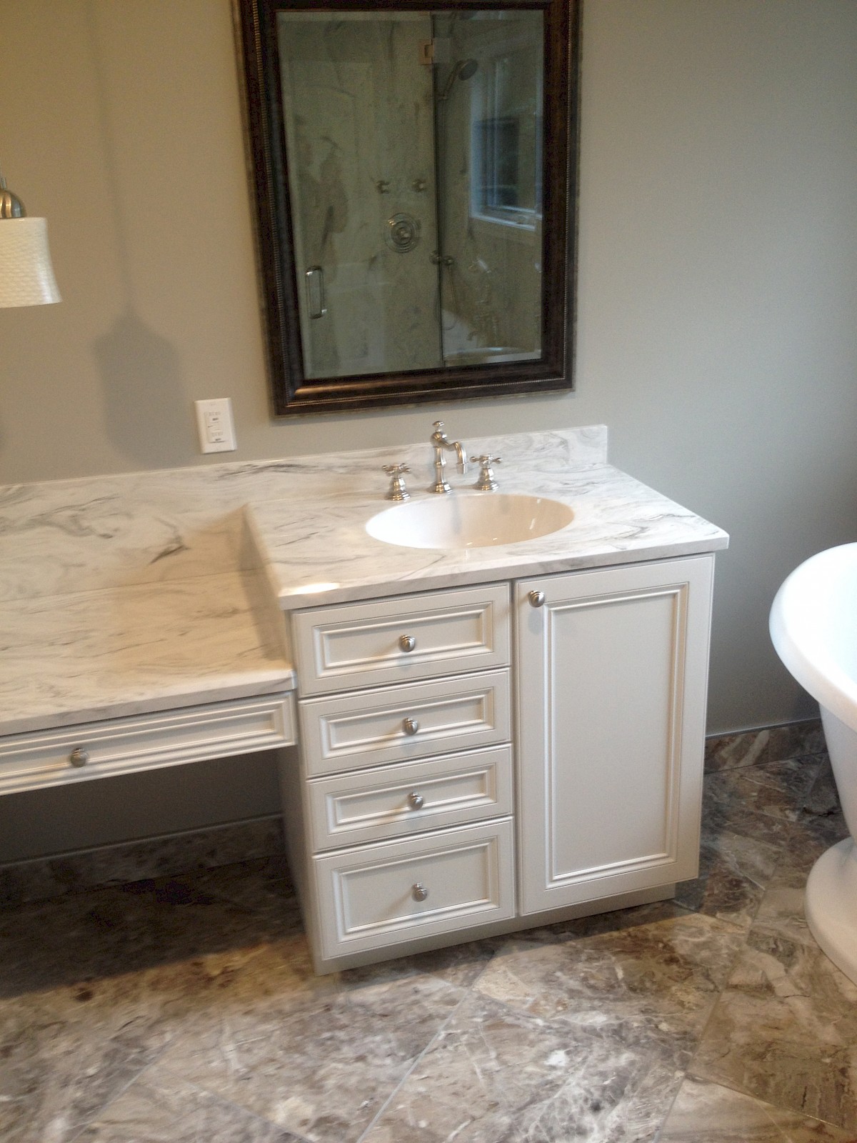 Cultured Marble and Granite vanity tops are nonporous, easy to clean and offer an integral bowl. An optional porcelain under-mount sink bowl is available in an oval or rectangular shape. These can be made with a molded on backsplash or come with a loose backsplash. Side splashes are always loose. All tops are set up custom to the measurements needed for your cabinets.